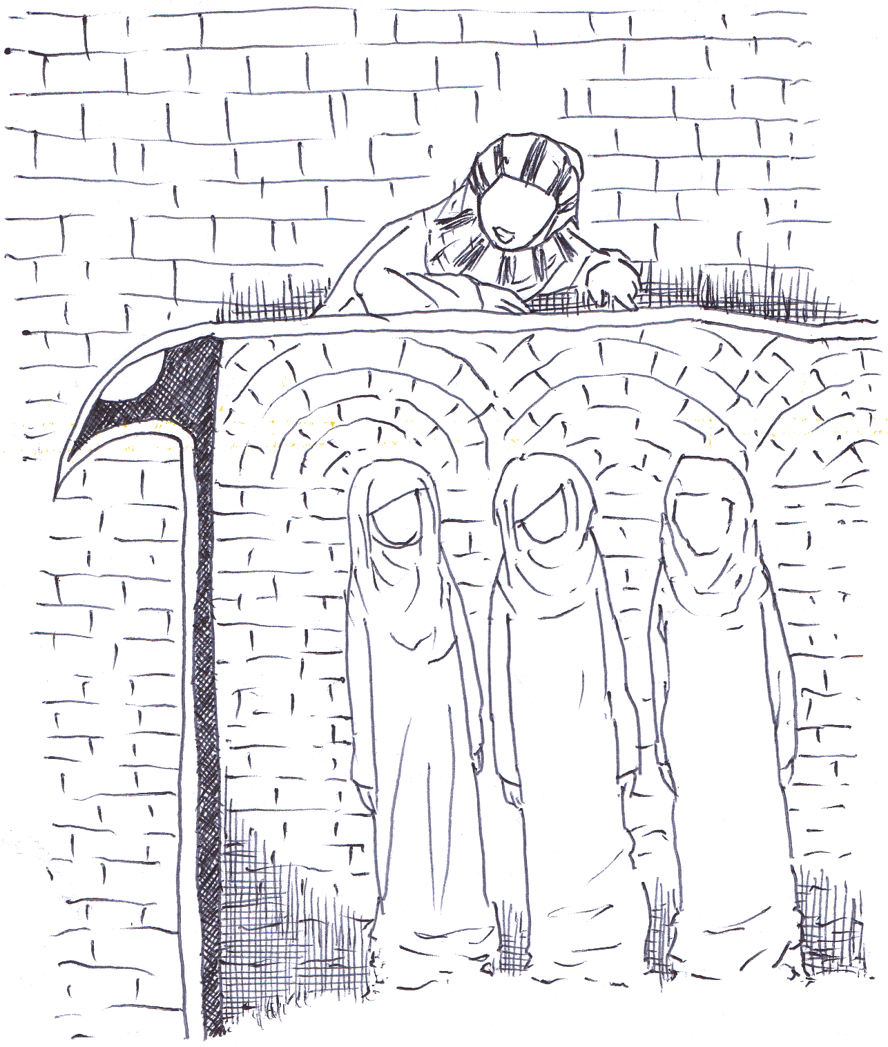 Ada tiga orang berkebangsaan Timur Tengah di dalam ruangan di sebelah bawah, seperti semacam penjara. Sedangkan di bagian atas adalah seorang dengan kebangsaan yang sama yang tampak lebih terpandang seperti seorang bangsawan. Di bagian samping kiri ada seperti semacam simbol gambar kepala burung elang. Seperti semacam simbol ajaran primitif tertentu di masa lalu. Bagian matanya berwarna merah, dan pada bagian garis tepinya berwarna emas. Selebihnya berwarna hitam.