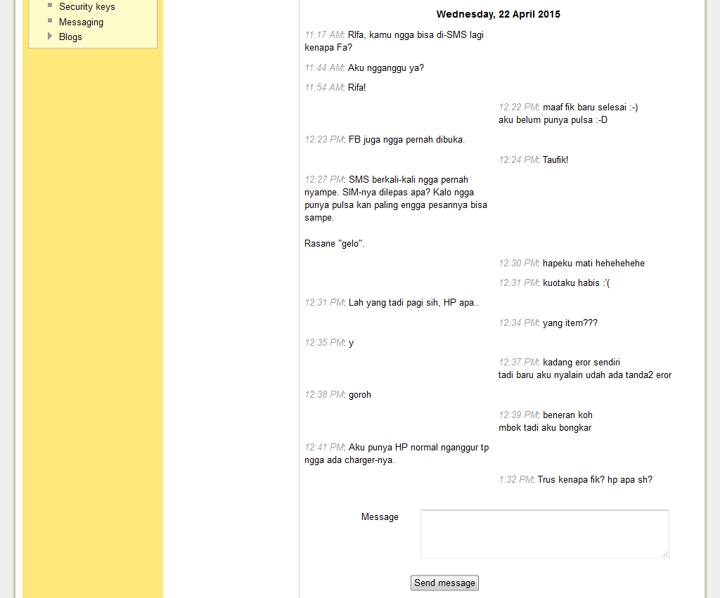 Tanggal 22 April 2015 yang lalu, Saya memberanikan diri untuk bertanya sekali lagi. Pagi itu sedang diadakan UTS materi Fundamental of Nursing II. Pengerjaan soal dilakukan secara online. Kebetulan pusat pembelajaran online kampus kami juga memiliki fasilitas instant messaging sederhana yang dapat digunakan oleh para mahasiswa untuk berkirim-kirim pesan. Waktu pengerjaan soal telah dimulai. Saya menunggu sambil mengerjakan soal sedikit demi sedikit sampai sekiranya suasana sudah tepat dimana setiap anak telah menjawab semua soal yang ada, namun belum memutuskan untuk keluar dari ruangan. Waktu itu Saya nekat mengirimi dia pesan dalam situasi yang masih sedang mengerjakan soal UTS: